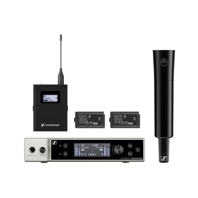 Der Handsender SKM ist mit den Mikrofonen Sennheiser MMD, MME, MMK, KK und MM kompatibel und verfügt über einen MUTE-Schalter zum schnellen Stummschalten des Mikrofons. Der Taschensender SK verfügt über einen 3,5-mm-Klinkenstecker zum Anschluss verschiedener Ansteck- oder Kopfmikrofone. Beide Sender verwenden Akkus vom Typ BA 70, die eine Betriebszeit von bis zu 12 Stunden bieten, oder alternativ Standard-AA-Batterien für eine Betriebszeit von ca. 8 Stunden.