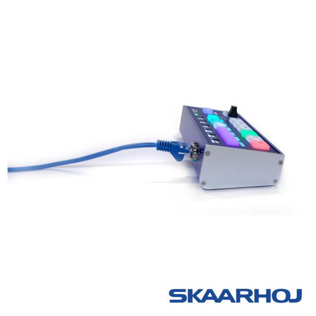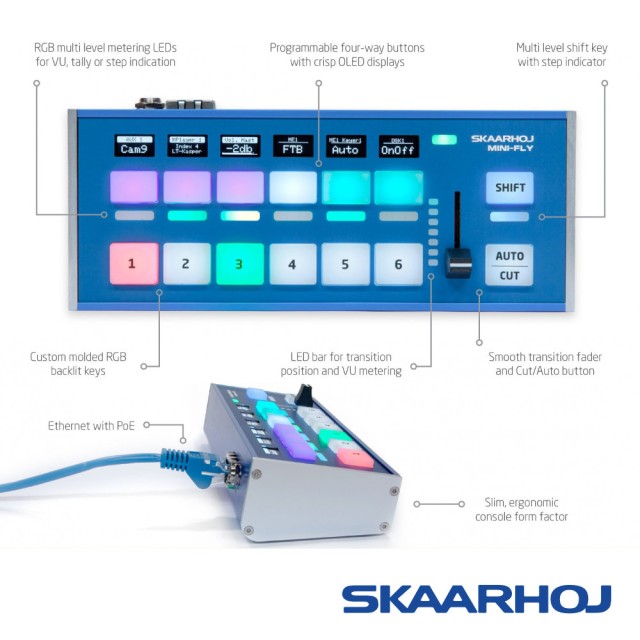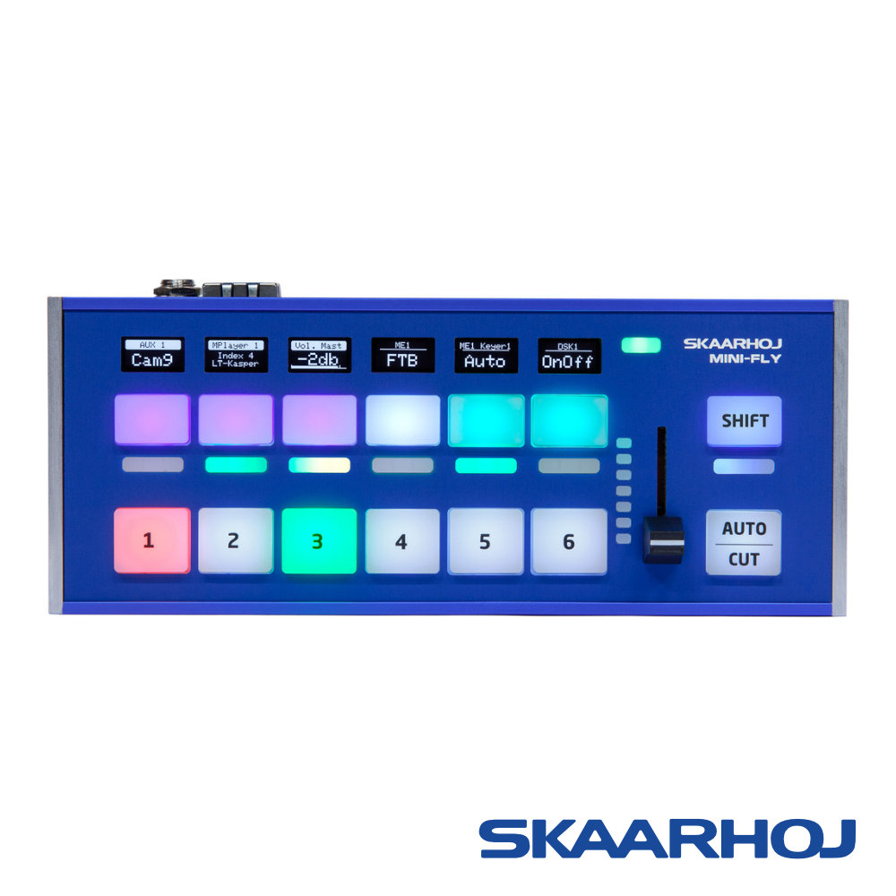 Daskompakte und flexible Skaarhoj Mini Fly-Bedienfeld wurde für die bequeme Steuerung von Overheads (einschließlich Blackmagic Design ATEM, vMix und vielen anderen) für kleinere Produktionen mit bis zu 6 Kamerasentwickelt. Trotz seiner geringen Größe bietet das OLED-Display RGB-hintergrundbeleuchtete Beschriftungen und Tasten, eine Audiopegel-/Interlace-Statusvorschau, ein Schwert zur Steuerung von Interlace-Effekten, ein 1/4"-20-Gewinde an der Unterseite für eine optionale Festmontage und eine Ethernet-Schnittstelle. PoE (IEEE802.3af), usw.