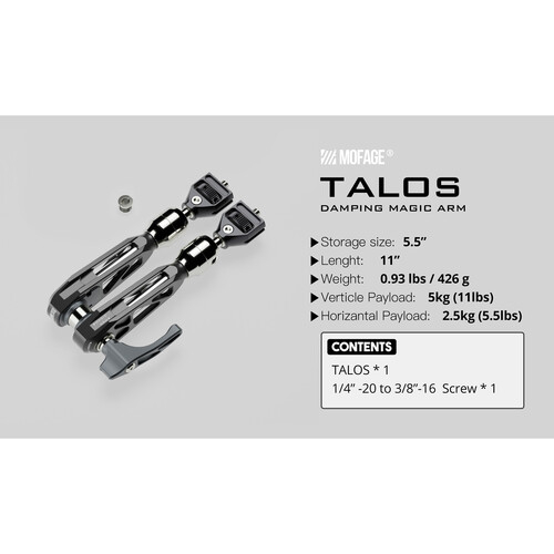 Der Mofage Talos Damping Magic Arm - Black ist ein hochwertiger Gelenkarm, der sich ideal für Fotografen, Videofilmer und Produzenten von Inhalten eignet, die eine robuste, verstellbare Befestigungslösung benötigen. Er verfügt über zwei verstellbare Kugelköpfe mit 1/4"-20 Rändelschrauben an jedem Ende, die eine präzise Positionierung von Kameras, Monitoren, LED-Leuchten und anderen Geräten ermöglichen.