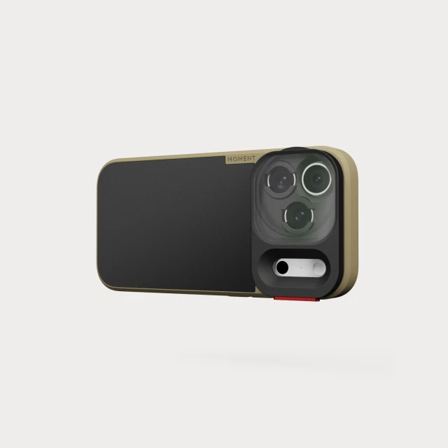 Das leichte AeroFrame-Gehäuse ist auf Geschwindigkeit und Langlebigkeit ausgelegt und lässt sich mit unserem sicheren QuickLock™-Drucksystem im Handumdrehen an einer Moment-Kameratasche (iPhone 15/16/17 Pro & Pro Max) befestigen
