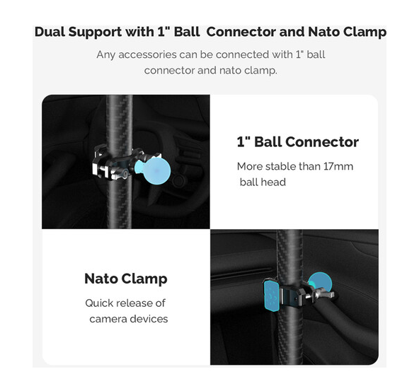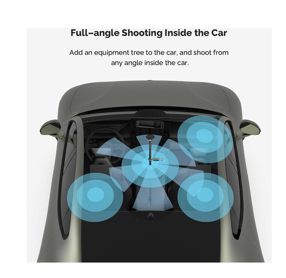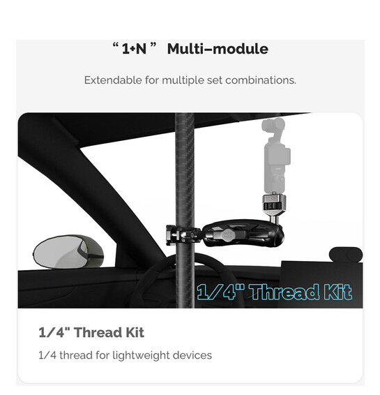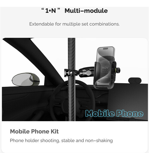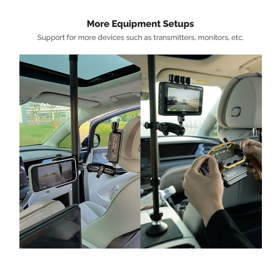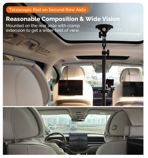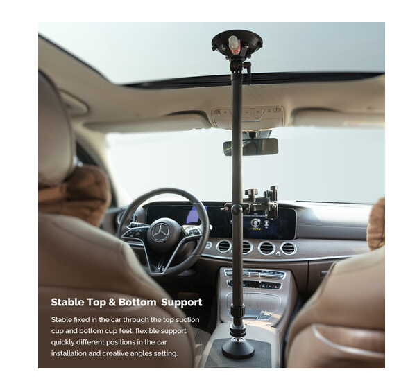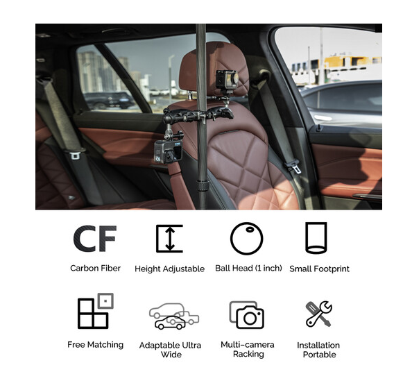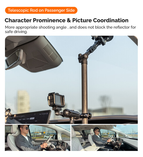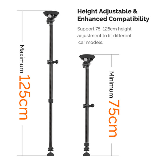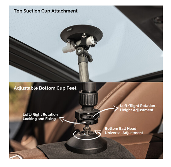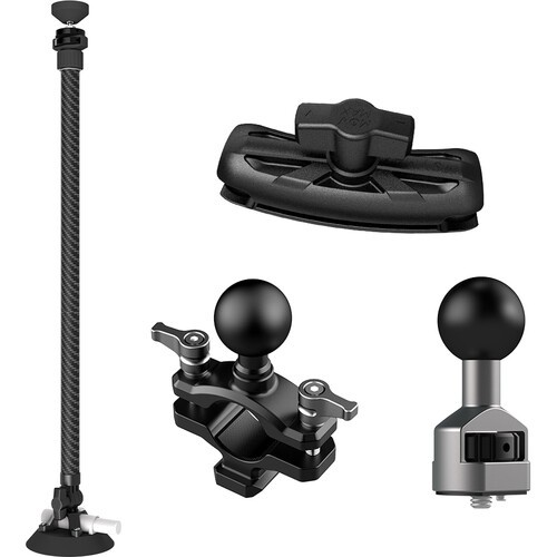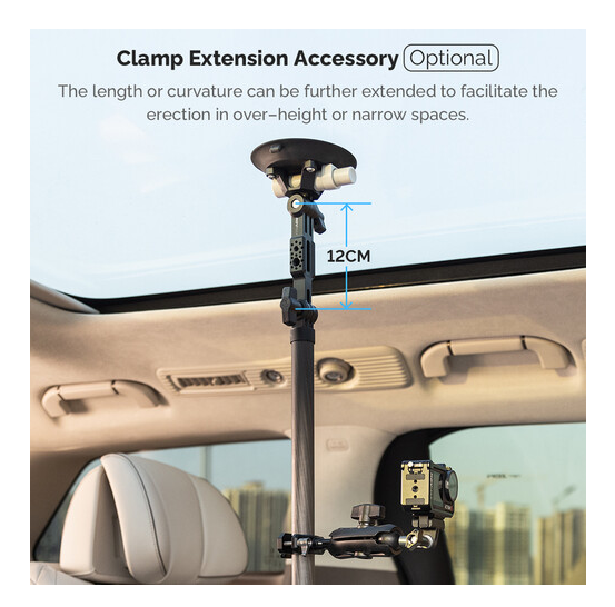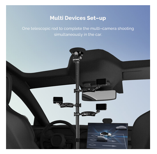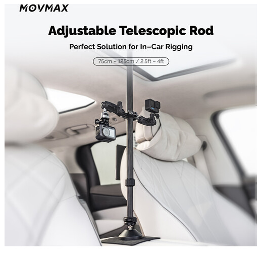 Die verstellbare Teleskopstange MOVMAX mit 1/4"-20-Schraube ermöglicht stabile Aufnahmen durch die Windschutzscheibe im Auto. Sie lässt sich von 75 bis 125 cm ausziehen, besteht aus Karbonfaser und verfügt über zwei Saugnäpfe zur Befestigung am Schiebedach und an der Mittelkonsole. Im Lieferumfang enthalten sind ein 1/4"-20-Kugelkopf, ein Doppelgelenkarm und eine Stangenklemme mit Kugelkopf für eine vollständig bewegliche Kamerapositionierung.