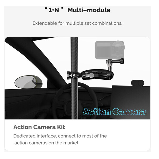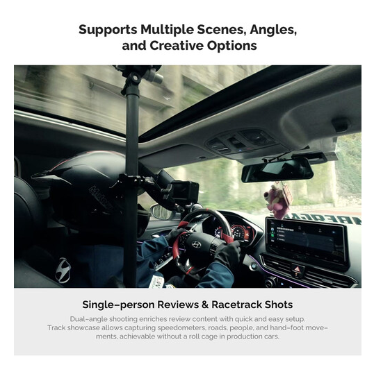 Die MOVMAX verstellbare Teleskopstange mit 1/4"-20-Schraube ist ein leichtes, hochfestes Stützsystem aus Kohlefaser, das für die sichere, vibrationsfreie Befestigung von Action- oder Kinokameras in Fahrzeugen entwickelt wurde und sich perfekt für klare POV-Aufnahmen durch die Windschutzscheibe eignet. Die Stange lässt sich über einen sicheren Drehverschluss stufenlos von 75 bis 125 cm (2,5 bis 4,1 Fuß) verstellen und eignet sich somit für Kleinwagen bis hin zu SUVs. Der obere Saugnapf haftet fest am Glas des Schiebedachs, während der untere Fuß an der Mittelkonsole oder dem Armaturenbrett verankert wird, wodurch eine starre dreieckige Struktur entsteht, die selbst bei aggressiver Fahrweise Verwacklungen minimiert. Dieses Kit enthält einen 1-Zoll-Kugelkopf mit 1/4"-20-Außengewinde zur direkten Befestigung der Kamera, einen 3,9-Zoll-Doppelkugelgelenkarm für eine vollständige 360°-Schwenk- und ±90°-Neigungsverstellung sowie eine spezielle Stangenklemme mit integriertem Kugelkopf zum Anbringen von Monitoren, Leuchten oder Zweitkameras. Das System eignet sich ideal für Automobilkinematografie, Motorsportberichterstattung und Vlogging und kombiniert hochwertige Materialien, präzise Gelenke und zuverlässige Vakuumhaftung für professionelle Stabilität im Fahrzeug.