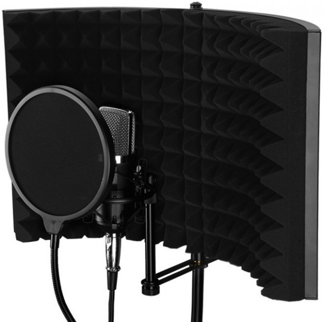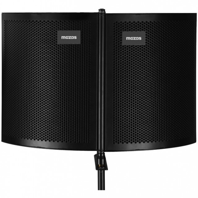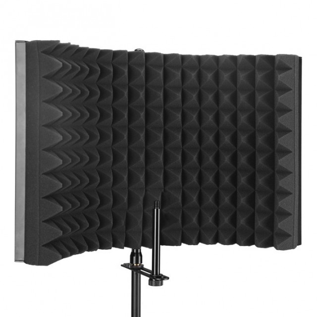 Moses Mshield - akustische Abschirmung, um ein klares Signal ohne Rauschen zu gewährleisten. Ideal zum Ersetzen von Gesang, Podcasts, Voice-overs usw. Die Innenwand besteht aus hochwertigem, geräuschabsorbierendem Akustikschaum, die Außenwand ist mit einer Aluminiumstruktur für sicheren Transport und Lagerung versehen. Der Schirm kann auf einem Mikrofonständer montiert werden.