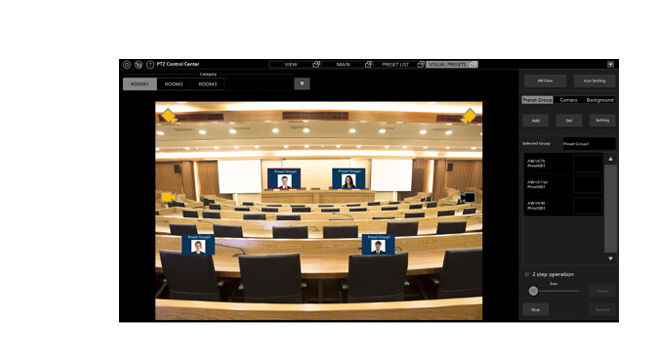 Die Software unterstützt zudem die Erstellung von Voreinstellungsgruppen und visuellen Layouts von Aufnahmeumgebungen, was verschiedene Raumkonfigurationen und einen schnellen Wechsel zwischen den Setups ermöglicht. Kamerapositionen werden als Symbole angezeigt, und aktive Kameras werden hervorgehoben, wodurch Bediener sofortiges visuelles Feedback erhalten. Dank des mausbasierten Steuerungssystems ist die Software auch für Nutzer mit begrenzter technischer Erfahrung leicht zugänglich.