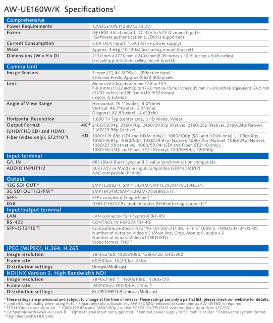 Neben der hohen Empfindlichkeit von F14 / 2.000 lx, die der einer Studiokamera entspricht, und der neuesten Generation der LUMIX Bildverarbeitung ist die AW-UE160 mit einem neu entwickelten Phasendetektions-Autofokus (PDAF) ausgestattet, der eine Hochgeschwindigkeitsfokussierung ermöglicht und auch für Aufnahmen von sich schnell bewegenden Motiven verwendet werden kann. Das neue PTZ ist mit einer Vielzahl von Funktionen ausgestattet, die eine hochpräzise Videoproduktion ermöglichen, darunter ein neuer PTZ-Mechanismus und eine Hybrid-Bildstabilisierung.