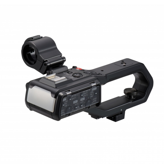 Mit dem abnehmbaren Handgriff VW-HU1 von Panasonic können Sie den Camcorder HC-X1500 um einen oberen Handgriff und einen Mikrofoneingang erweitern. Das Gerät verfügt über zwei 3-polige XLR-Audioeingänge, einen Mikrofonhalter, eine Start-/Stopptaste für die Aufnahme, eine Zoomwippe und eine eingebaute LED-Leuchte.