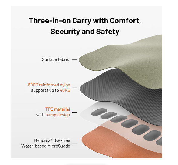 Das TPE-Futter mit Noppen sorgt für zusätzlichen Komfort bei längerem Gebrauch und beugt Verspannungen im Nacken oder in den Schultern vor. Dieser nur 70 g leichte Gurt besteht aus atmungsaktivem, umweltfreundlichem, verstärktem 600D-Nylon und verfügt über eine stilvolle Oberfläche in Earth Brown. Er vereint Sicherheit, Komfort und Ästhetik für Fotografen, die viel unterwegs sind.