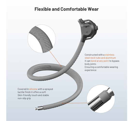 Der verstellbare Halsbügel besteht aus Edelstahl und Aluminium und ist so flexibel, dass er sich in den perfekten Winkel biegen lässt, dabei aber dennoch robust und stabil bleibt. Eine weiche, hautfreundliche Silikonbeschichtung sorgt für Komfort bei längerem Gebrauch und verfügt über eine rutschfeste Oberfläche, um die Aufnahmen stabil zu halten.
