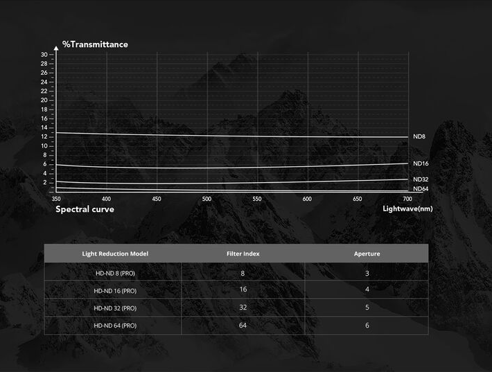 Vier ND-Filter: ND8 (3 Blendenstufen), ND16 (4 Blendenstufen), ND32 (5 Blendenstufen), ND64 (6 Blendenstufen)