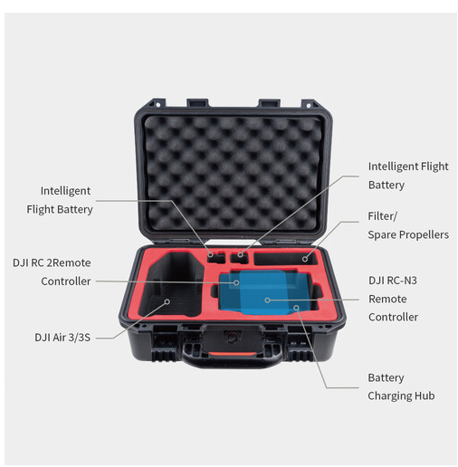 Im Inneren bieten präzise gestaltete Fächer sicheren Platz für die DJI Air 3 oder Air 3S Drohne, eine kompatible Fernsteuerung, bis zu sechs intelligente Flugakkus (einschließlich eines in der Drohne) und wichtiges Zubehör wie ein Ladehub, Netzkabel, Filter und Ersatzpropeller. Eine EVA-Schaumstoffauskleidung sorgt für zusätzliche Polsterung, um Ihre Ausrüstung während des Transports zu schützen.