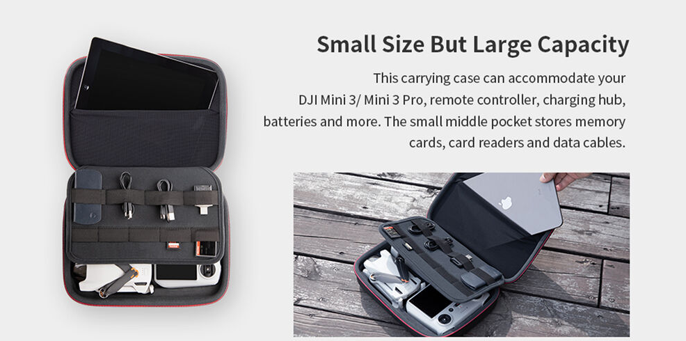 Zusätzlicher Stauraum bietet eine mittlere Klappe mit elastischen Zubehörgurten für Smartphones, Speicherkarten, Kabel und andere kleine Geräte sowie eine Netztasche für ein Tablet. Die Tasche verfügt außerdem über einen versteckten Tragegriff und einen doppelten Reißverschluss für einen sicheren und bequemen Transport. Diese kompakte, leichte und äußerst schützende Tasche ist ideal für Drohnenbegeisterte, die unterwegs eine übersichtliche und sichere Aufbewahrung wünschen.