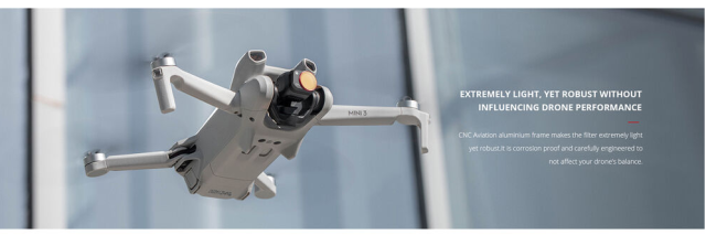 Der Filter besteht aus doppelt beschichtetem japanischem AGC-Optikglas und sorgt für minimale Lichtbrechung und außergewöhnliche optische Klarheit. Der leichte und dennoch robuste CNC-Aluminiumrahmen ist korrosionsbeständig und so konstruiert, dass er die Balance der Drohne während des Fluges aufrechterhält. Durch seine beidseitige Beschichtung ist er wasserfest, ölbeständig und kratzfest und bietet somit Langlebigkeit und dauerhafte Leistung. Mit einer Lichtreduzierung von 1 Blendenstufe ermöglicht er eine kontrollierte Belichtung bei hellen Lichtverhältnissen.