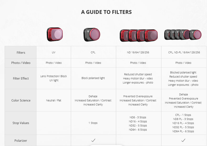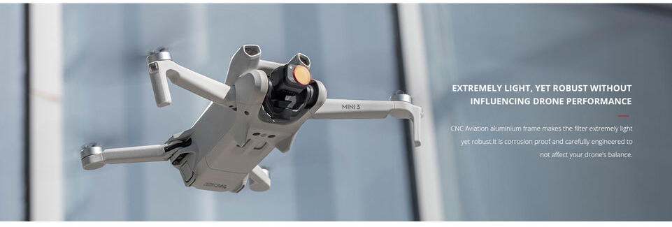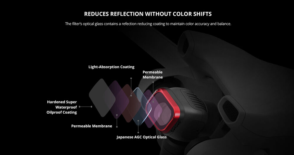 Jeder Filter ist aus präzisionsgeschliffenem japanischem AGC-Optikglas mit niedrigem Brechungsindex gefertigt, um eine genaue Farbwiedergabe und hochauflösende Bilder zu gewährleisten. Die doppelseitige Mehrfachbeschichtung sorgt für Wasser-, Öl- und Kratzfestigkeit, sodass die Filter zuverlässig im Freien und in der Luft eingesetzt werden können. Der leichte und dennoch robuste CNC-Aluminiumrahmen ist korrosionsbeständig und so konstruiert, dass er die richtige Gimbal-Balance aufrechterhält und eine stabile Flugleistung gewährleistet.