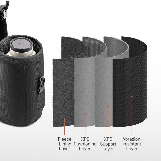 Die Außenseite besteht aus strapazierfähigem Gewebe, das Spritzwasser und Staub abhält. Ein spezieller Reißverschluss mit erhöhter Wetterbeständigkeit verhindert das Eindringen von Feuchtigkeit. Das Innenfutter bestehtaus Memory-Schaumstoff, der sich der Form des Objektivs anpasst, Stöße absorbiert und auch bei häufigem Gebrauch Kratzer verhindert.