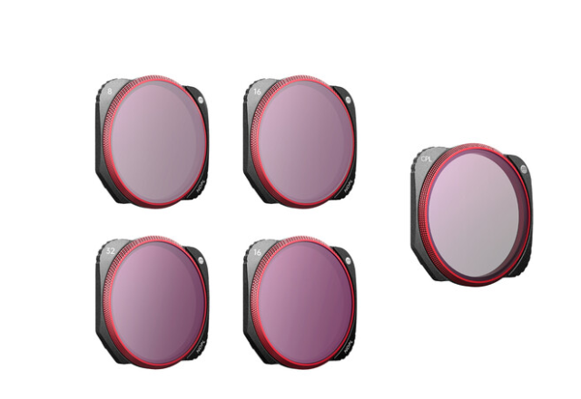 Jeder Filter besteht aus doppelt beschichtetem japanischem AGC-Optikglas und ist für einen niedrigen Brechungsindex geschliffen und poliert, um eine genaue Farbwiedergabe und scharfe Bilder sowohl für Fotos als auch für Videos zu gewährleisten. Die wasserfesten, ölbeständigen und kratzfesten Beschichtungen schützen das Glas in anspruchsvollen Flugumgebungen. Die Filter sind in einem leichten, CNC-gefrästen Aluminiumrahmen untergebracht, korrosionsbeständig und präzise konstruiert, um während des Fluges die richtige Gimbal-Balance aufrechtzuerhalten.