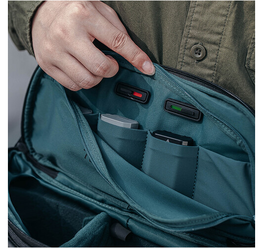Für zusätzliche Vielseitigkeit kann der mittlere Teil geöffnet und angehoben werden, um das Fassungsvermögen der Tasche von 7 l auf 9 l zu erweitern. Im erweiterten Modus bietet die Tasche Platz für eine Kamera mit einem vertikal montierten 70–200-mm-Objektiv, ein zusätzliches Objektiv und ein iPad Pro mit einer Größe von bis zu 11 Zoll. Im Inneren schützen verstellbare, gepolsterte Trennwände Ihre Ausrüstung, während die Batterietasche mit Ladeanzeige dabei hilft, geladene und leere Batterien effizient zu verwalten.
