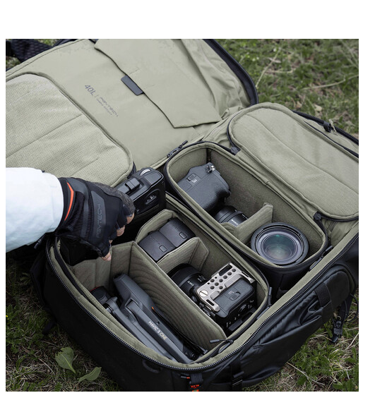 Der Rucksack besteht aus PU-beschichtetem Cordura-Material und ist wasserabweisend sowie strapazierfähig. Der 3D-Bogenrahmen aus Luftfahrtaluminium sorgt für Struktur und Stabilität, während die 3D-geformten Schulter- und Hüftgurte sowie das ergonomische Air-Mesh-Rückenteil für langen Tragekomfort sorgen. Der schnelle seitliche Zugriff und die seitlichen Wasserflaschentaschen sorgen für zusätzlichen Komfort während der Aufnahmen, und die 4-stufig verstellbare Rückenlänge ermöglicht eine individuelle Anpassung an verschiedene Körperformen.