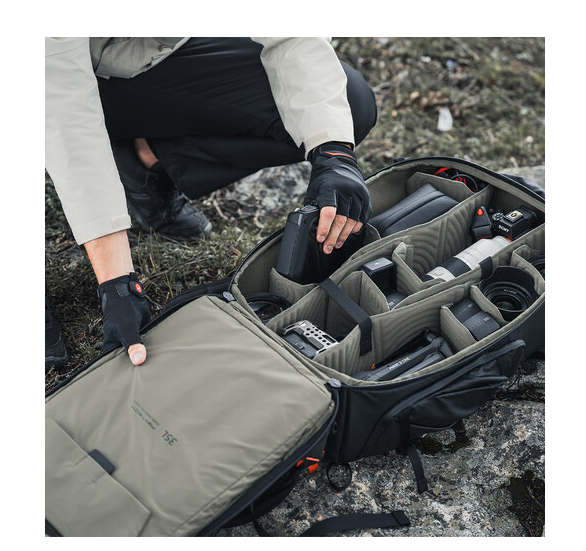 Das erweiterbare Frontfach bietet Platz für Gimbals, Stative oder sperriges Zubehör, während mehrere Innen- und Außentaschen Platz für technische Ausrüstung, persönliche Gegenstände und Outdoor-Utensilien bieten. Spezielle Befestigungspunkte ermöglichen die Sicherung von Trekkingstöcken, Eispickeln oder einer Campingmatte, wodurch sich der Rucksack ideal für Reisen, Wanderungen und Feldarbeit eignet.