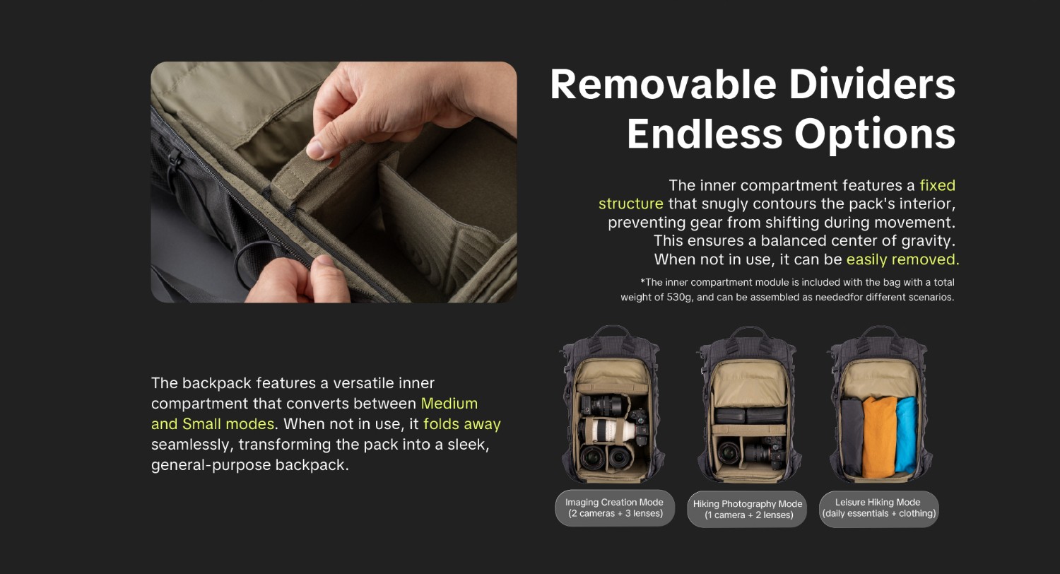 Der Rucksack wird mit einem standardmäßigen Innenfach mit Doppelfunktion geliefert (umschaltbar zwischen mittlerer und kleiner Konfiguration). Wenn es nicht benötigt wird, kann es weggefaltet werden, wodurch der Hauptrucksack sofort in einen Allzweck-Outdoor-Rucksack verwandelt wird.