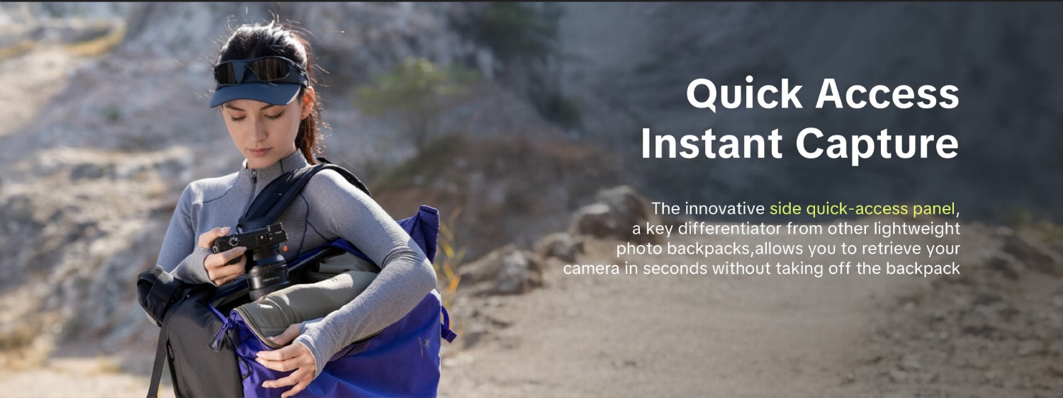Das innovative Schnellzugriffsfach an der Seite, ein wesentliches Unterscheidungsmerkmal zu anderen leichten Fotorucksäcken, ermöglicht es Ihnen, Ihre Kamera in Sekundenschnelle zu entnehmen, ohne den Rucksack abnehmen zu müssen.