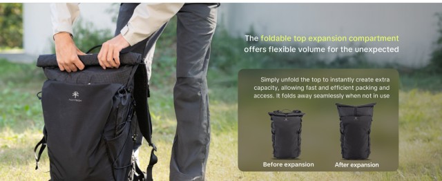 Das faltbare obere Erweiterungsfach bietet flexibles Volumen für Unvorhergesehenes.