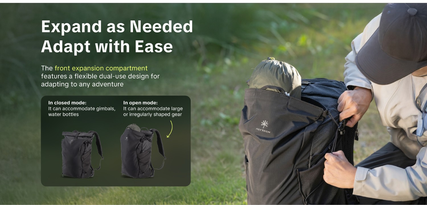 Das vordere Erweiterungsfach verfügt über ein flexibles Dual-Use-Design, das sich an jedes Abenteuer anpassen lässt.