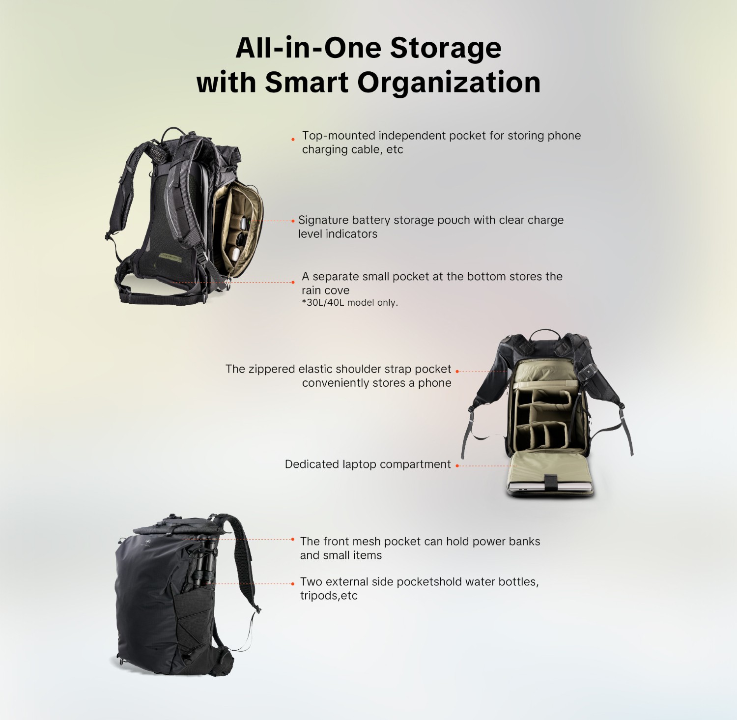 ○ Unabhängige Tasche oben zur Aufbewahrung von Telefon, Ladekabel usw.