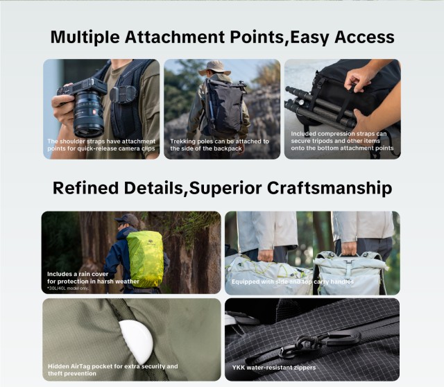 Das innovative Schnellzugriffsfach an der Seite, ein wesentliches Unterscheidungsmerkmal zu anderen leichten Fotorucksäcken, ermöglicht es Ihnen, Ihre Kamera in Sekundenschnelle zu entnehmen, ohne den Rucksack abnehmen zu müssen.