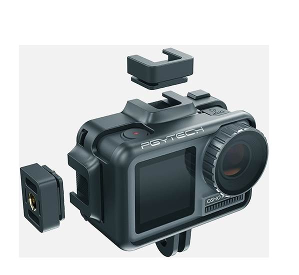 Der PGYTECH-Kamerakäfig für Osmo Action bietet ein passgenaues Design mit mehreren Zubehörhalterungen, an denen Sie Mikrofone, Leuchten und Griffe befestigen können, während Sie weiterhin uneingeschränkten Zugriff auf den Bildschirm und die Bedienelemente der Kamera haben.