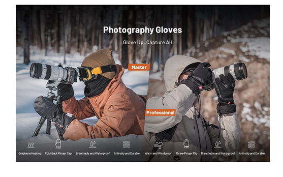Die Handschuhe kombinieren 3M Thinsulate-Baumwolle, ein wasserdichtes und atmungsaktives HIPORA-Futter, eine winddichte Schicht und spritzwassergeschütztes Material, um Ihre Hände vor Kälte, Wind und Feuchtigkeit zu schützen. Die gepolsterten Lederhandflächen und die SBR-Polsterung verbessern die Griffigkeit und den Komfort, während das Samtfutter für Weichheit und Isolierung sorgt. Zurückklappbare Fingerspitzen ermöglichen einen einfachen Zugriff für präzise Kamerasteuerung, und ein Anti-Verlust-Handgelenkband und eine Schnalle halten die Handschuhe sicher und zusammen. Diese Handschuhe sind ideal für extreme Temperaturen von -31 bis 32 °F (-35 bis 0 °C) und der ultimative Begleiter für Outdoor-Fotografie im Winter.