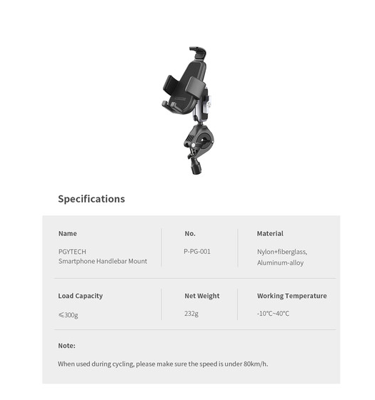 Mit der PGYTECH P-PG-001 Smartphone-Lenkerhalterung haben Sie Ihr Smartphone während der Fahrt griffbereit und sicher verstaut. Diese Halterung wurde für Fahrräder, Motorräder und Seitenspiegelhalterungen entwickelt und lässt sich an Lenkern mit einem Durchmesser von 0,3 bis 1,4 Zoll befestigen, sodass sie mit den meisten Standardlenkern kompatibel ist. Die vollständig umschließende Halterung bietet umfassenden Schutz für Ihr Smartphone und verfügt über rutschfeste Gummierung an der Rückseite, den Armen und der Oberseite, um ein Verrutschen oder Vibrationen zu verhindern.
