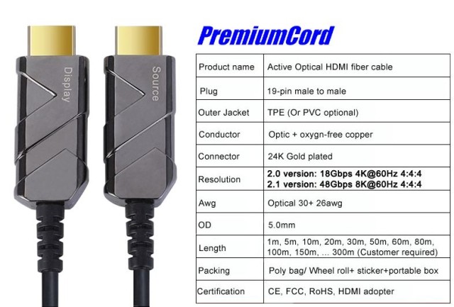 PremiumCord kphdm21x20 Ultra High Speed HDMI 2.1 Glasfaser AOC Kabel 8K@60Hz, vergoldet