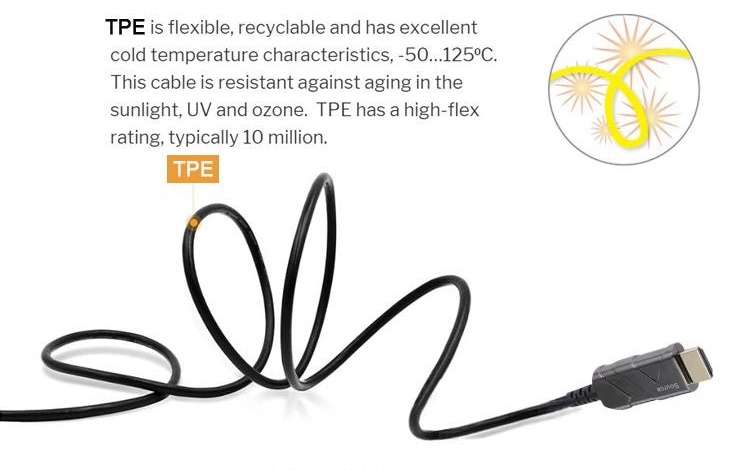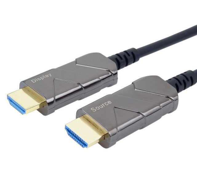 Das optische Hybrid-HDMI™-Kabel (Glasfaser + Kupfer) verbindet Geräte über lange Strecken von bis zu 100 m ohne Datenverlust - auch in Bereichen mit hoher elektromagnetischer Strahlung. Durch seine besonders dünne und leichte Konstruktion eignet es sich perfekt für alle Arten von Installationen.