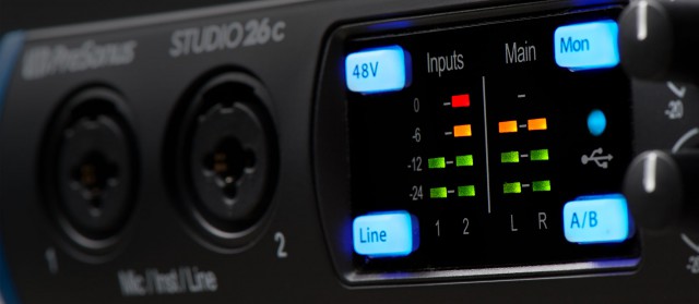 Professionelle Werkzeuge machen jede Arbeit leichter. Aus diesem Grund haben wir das Studio 26c mit einer professionellen Eingangs- und Ausgangsmessung ausgestattet, die es Ihnen ermöglicht, die Eingangs- und Mischpegel zu überwachen, wenn Sie alleine aufnehmen. Eine einfach zu bedienende direkte Monitorsteuerung verbindet analoge Eingangssignale mit der Wiedergabe von Ihrem Computer und vereinfacht so die Überwachung. Zwei Paare von Ausgängen ermöglichen zwei verschiedene Stereomischungen. Mit der Cue A/B-Taste können Sie beim Abhören über Kopfhörer zwischen verschiedenen Mischungen wechseln - ideal für Live-Auftritte und im Studio.