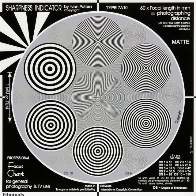 Der neue Putora 7A10 Schärfe-Indikator ist die fortschrittlichste und genaueste Testtabelle auf dem Markt. Jeder Fotograf kann damit die Schärfe und Auflösung aller Film-, Video- und Kameratypen genau beurteilen. Der Schärfeindikator besteht aus Testzielen mit konzentrischen Kreisen, die auf dem Hintergrund in Höhe des Referenzfeldes aufgedruckt sind. Der Hintergrund hat das gleiche Reflexionsvermögen wie das durchschnittliche Reflexionsvermögen der Zielscheiben. Wenn die Zielscheibe mit dem Hintergrund zu verschmelzen scheint, zeigt die Tabelle an, dass die Zielscheibe für das zu prüfende System unscharf ist.