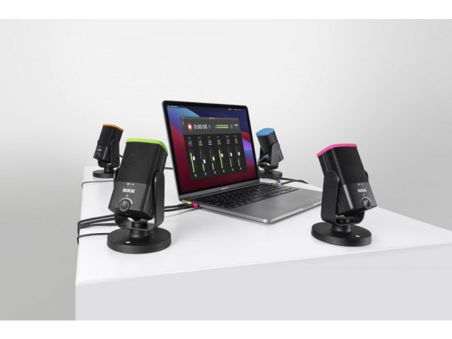 Die farbigen Mikrofonabdeckungen und -ringe entsprechen den Farben der einzelnen Kanäle in der RØDE Connect-App, was die Übersicht über den Lautsprecher erleichtert.