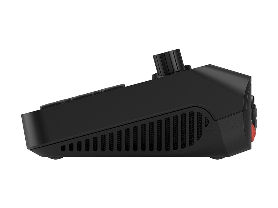 Auf der Vorderseite befinden sich fünf Szenenumschalttasten, ein dedizierter Bereich für die Aufnahme, zwei hintergrundbeleuchtete Drehgeber, die Tasten „AUTO“ und „CUT“ sowie ein 2-Zoll-Farb-Touchscreen für detaillierte Einstellungen.