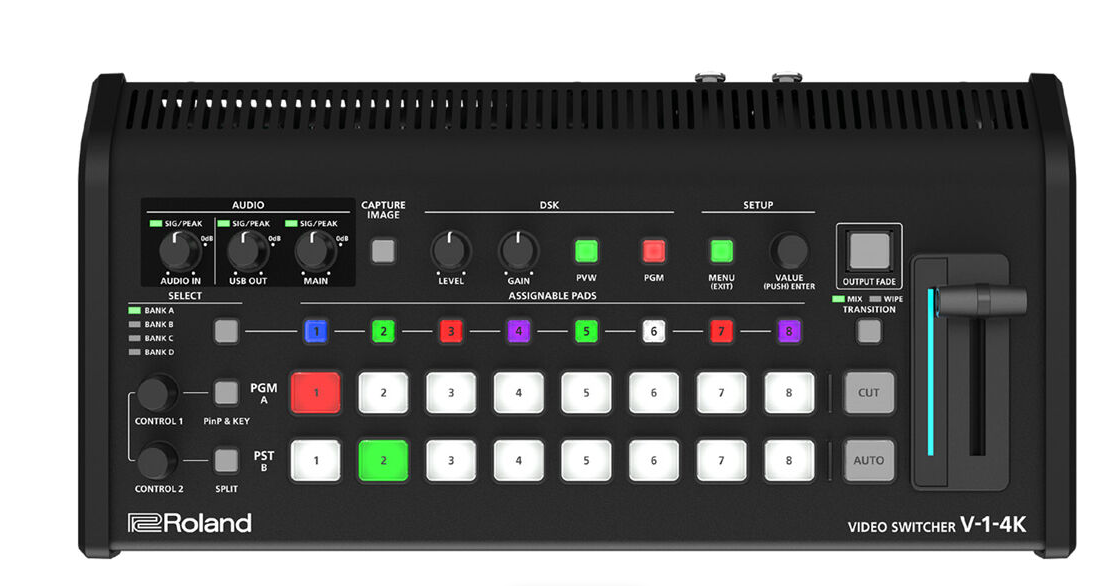 Der Roland V-1-4K Video-Switcher ist eine kompakte, vielseitige Lösung für Live-Streaming und kleinere Produktionen, die bis zu UHD 4K60 HDR unterstützt. Mit 5 HDMI-Eingängen, 5 HDMI-Ausgängen, USB-C-Streaming und taktiler Steuerung ermöglicht er nahtloses Umschalten, Zuschneiden und Herunterskalieren für Videos in professioneller Qualität in Unternehmens-, Bildungs- oder kirchlichen Einrichtungen.