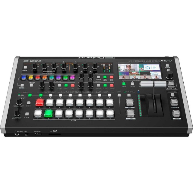 Acht vom Benutzer zuweisbare Pads ermöglichen eine schnelle Kontrolle über die vielen Funktionen des V-80HD. Die Pads sind in acht Bänken organisiert und bieten direkten Zugriff auf 64 verschiedene Funktionen. Rufen Sie Szenen, Makros und Sequenzerschritte auf, triggern Sie Audio- und Videoclips, starten/stoppen Sie Streams und mehr. Es ist sogar möglich, Funktionen in der Graphics Presenter Software zu steuern, wenn der Host-Computer über USB mit dem V-80HD verbunden ist.
