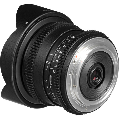 Die Blendenöffnung reicht von T3,8 bis T22. Da T3,8 die größte Blendenöffnung ist, eignet sich dieses Objektiv am besten für Umgebungen mit ausreichend Licht oder mit einer integrierten Lichtquelle. Die Blende lässt sich manuell ohne Rastung mit einem stufenlosen, glatten Blendenring einstellen. Sowohl der Blendenring als auch der Fokussierring haben eine 0,8er-Teilung, falls Sie einen Follow-Focus verwenden möchten. Der Fokusring ist ebenfalls gut gedämpft und sehr leichtgängig. Das Objektiv bietet keinen Autofokus, aber bei Fischaugen-Objektiven erscheinen die Objekte ohnehin meist im Fokus. Die minimale Fokussierentfernung beträgt 30 cm (11,8").