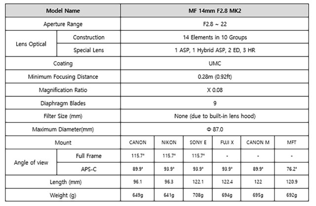 Das MF 14mm F2.8 MK2 besteht aus 14 Linsen in 10 Gruppen, darunter drei Linsen mit hohem Brechungsindex (HR), eine asphärische Linse (ASP), eine hybridasphärische Linse (H-ASP) und zwei ED-Linsen. Die optische Konstruktion des Objektivs in Verbindung mit der Ultra-Multi-Vergütung (UMC) auf der Frontlinse sorgt für scharfe Bilder mit minimalen Farbfehlern, eine Mindestfokussierentfernung von 0,28 m und einen Bildwinkel von 115,7˚.