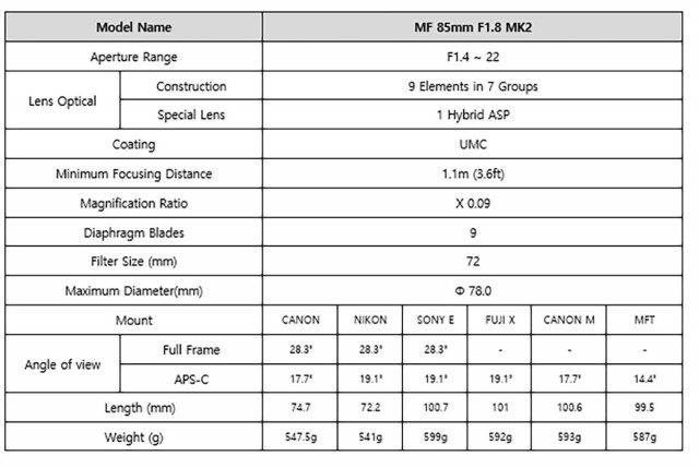Das MF 85mm F1,4 MK2 besteht aus 9 Linsen in 7 Gruppen, darunter ein asphärisches Hybridelement (H-ASP) und eine schützende UMC-Frontlinse (Ultra Multi Coating). Das Objektivdesign sorgt für scharfe Bilder mit minimalen Farbfehlern.