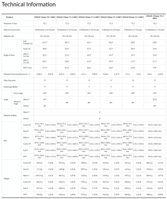 Das VDSLR MK2 Set umfasst 6 der am häufigsten verwendeten Brennweiten: 14mm T3.1, 24mm T1.5, 35mm T1.5, 50mm T1.5, 85mm T1.5 und 135mm T2.2. Die Reihe ist äußerst vielseitig und für 6 Kameraanschlüsse erhältlich: Canon EF, Sony E, Nikon F, Canon M, Fuji X und MFT. Diese neue Serie übernimmt die hervorragende Bildqualität der vorherigen Serie: Alle 6 Objektive verfügen über spezielle Glaselemente wie ASP- oder ED-Linsen, die sphärische und optische Aberration reduzieren und so für klare und lebendige Bilder sorgen. Das 14-mm- und das 50-mm-Modell verfügen außerdem über ein asphärisches Hybridelement, um die kompakte Größe beizubehalten, ohne die Leistung zu beeinträchtigen.