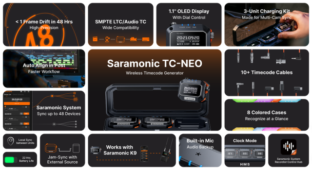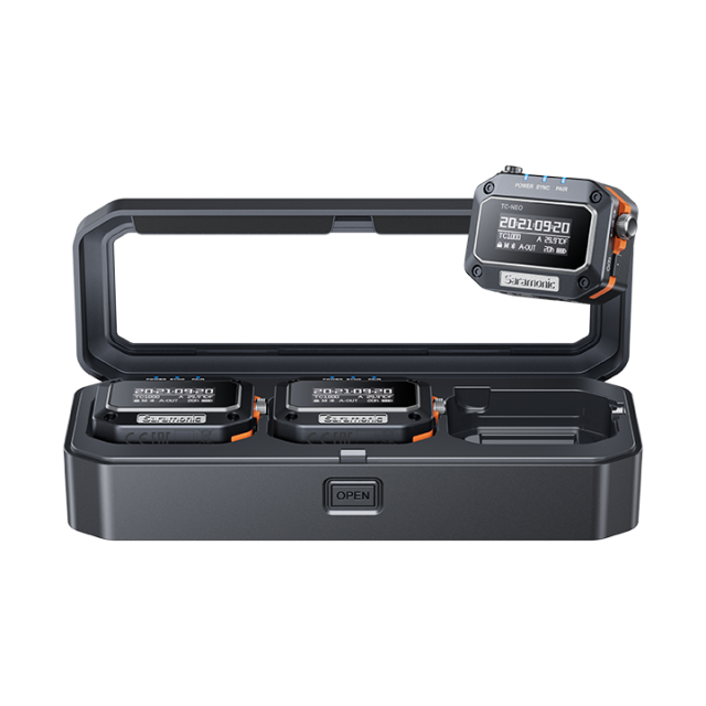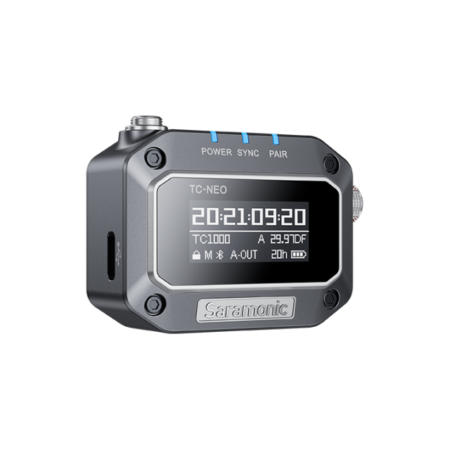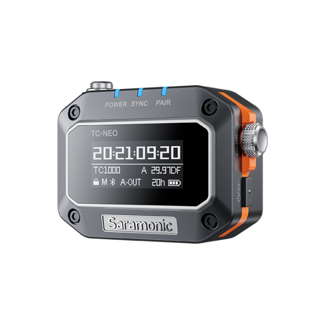 Der Saramonic TC-NEO ist ein hochpräziser drahtloser Timecode-Generator, der für eine einwandfreie Synchronisation bei Mehrkamera- und Außenaufnahmen entwickelt wurde. Sein hochpräziser TCXO bietet eine Genauigkeit von ±0,5 ppm und sorgt dafür, dass die Abweichung über einen Zeitraum von 48 Stunden auf weniger als ein Frame begrenzt bleibt – eine entscheidende Eigenschaft für lange Dreharbeiten. Das Gerät bietet flexible Synchronisationsmethoden für jede Konfiguration, darunter One-Tap-Synchronisation für bis zu 48 Geräte über die Saramonic System App (Bluetooth), direkte drahtlose Synchronisation zwischen Geräten (2,4 GHz) oder eine kabelgebundene Verbindung über den 3,5-mm-Timecode-Anschluss. Das hochauflösende 1,1-Zoll-OLED-Display ermöglicht eine klare Echtzeitüberwachung und wird über benutzerfreundliche Drehregler bedient. Jedes TC-NEO-Gerät wird von einem integrierten 1150-mAh-Lithium-Polymer-Akku mit einer Betriebsdauer von bis zu 22 Stunden im Dauerbetrieb gespeist. Für Setups mit mehreren Geräten kann das mitgelieferte Ladekit drei Geräte aufnehmen und mit Strom versorgen, sodass den ganzen Tag über Strom zur Verfügung steht und der Arbeitsablauf durch die Aktivierung des Uhrmodus mit einem Tastendruck vereinfacht wird. Damit ist das TC-NEO ideal für jede Produktion, von Dokumentarfilmen bis hin zu Kinofilmen.