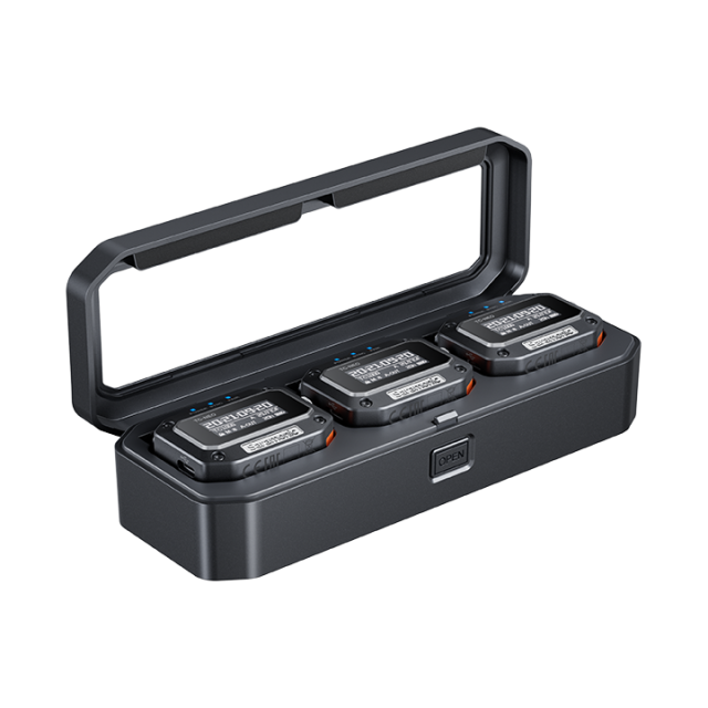 Drei-Kamera-Setups sind am Set Standard. TC-NEO liefert ein einzigartiges Ladekit, das Platz für drei Geräte bietet und diese mit Strom versorgt, wodurch Ihr Multi-Cam-Workflow optimiert wird. Jedes Gerät läuft mit einer einzigen Ladung bis zu 22 Stunden* oder mit dem Case bis zu 48 Stunden*. Der USB-C-Eingang sorgt während der gesamten Aufnahme für eine kontinuierliche Stromversorgung. Und hier ist noch ein nettes kleines Extra: Halten Sie beim Laden die Seitentaste 1,5 Sekunden lang gedrückt, und alle drei Displays verwandeln sich in perfekt synchronisierte Digitaluhren. So bringen Sie ein wenig Spaß in den hektischen Arbeitsablauf.