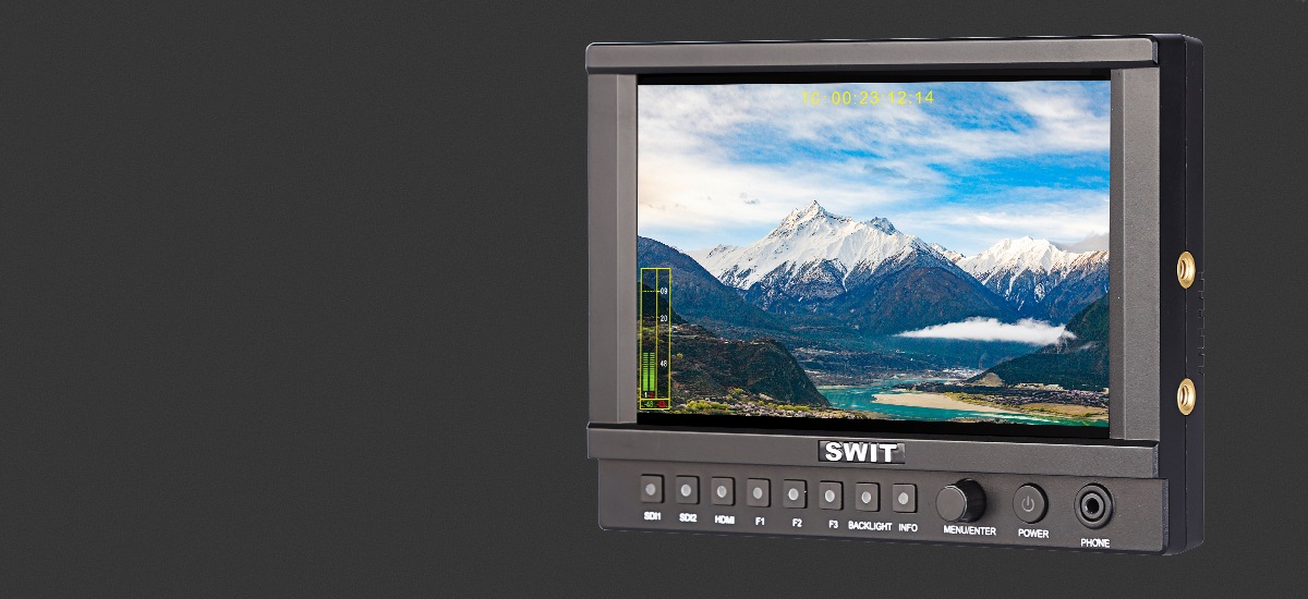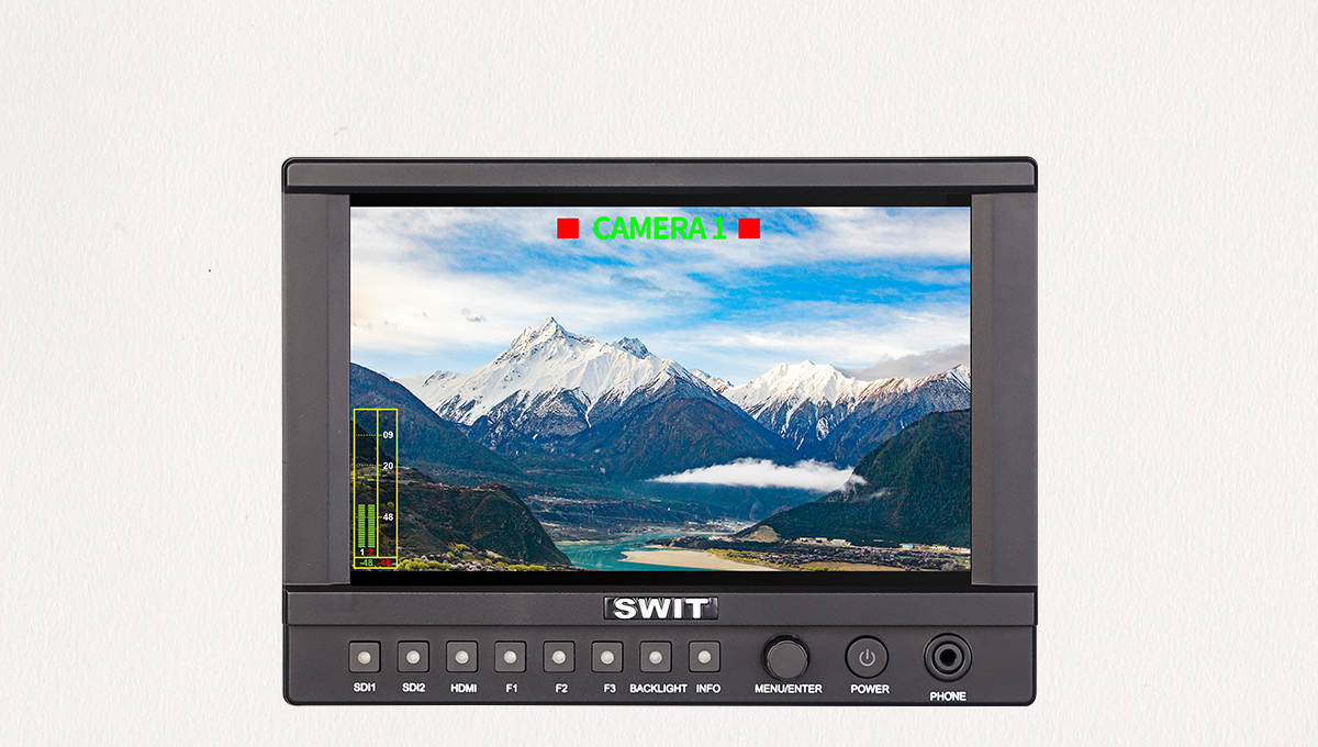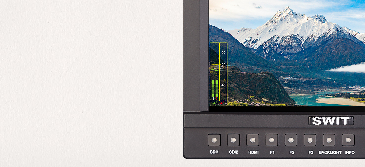 Der CM-S73H unterstützt die Anzeige von eingebetteten SDI-16-Kanal- und HDMI®-2-Kanal-Audiometern mit Markierungen und Warnhinweisen bei Audioanomalien. Der Benutzer kann auch 2 beliebige Audiokanäle für die Ausgabe über eine 3,5-mm-Buchse oder Lautsprecher auswählen. Die Position des Audiometermusters kann aus einer der vier Ecken ausgewählt werden, und Sie können wählen, ob nur 2 Kanäle, 8 Kanäle oder alle 16 Kanäle angezeigt werden sollen. Auch Skalenmarkierungen, Warnhinweise und die Durchsichtigkeit des Audiomessmusters sind wählbar.