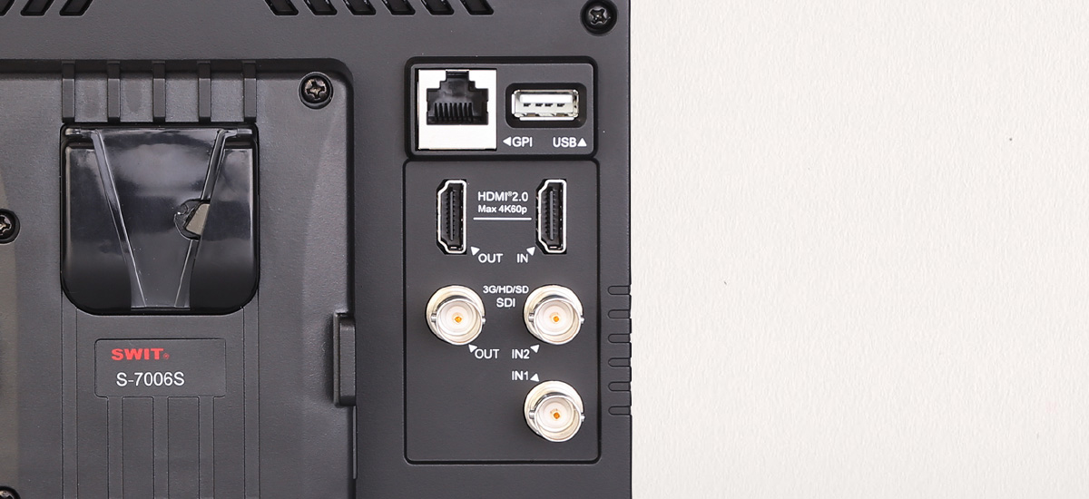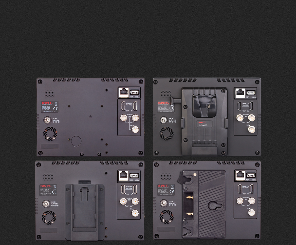 Der CM-S73H unterstützt eine Gleichstromversorgung von 6,5-17 V über eine verriegelbare 5,5-mm-Gleichstrombuchse und kann SWIT-Batterieplatten der Serie S-7006 (V-Mount/Gold-Mount/DV) zur Stromversorgung verwenden.