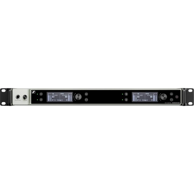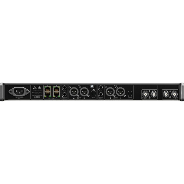 19"-Rack-Empfänger mit vier Kanälen, Antennen und Dante-Audio-Netzwerkschnittstelle.