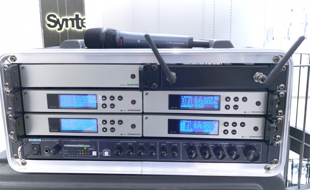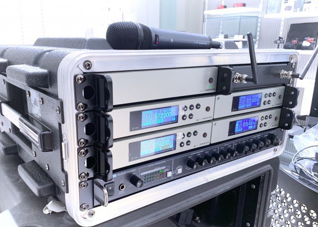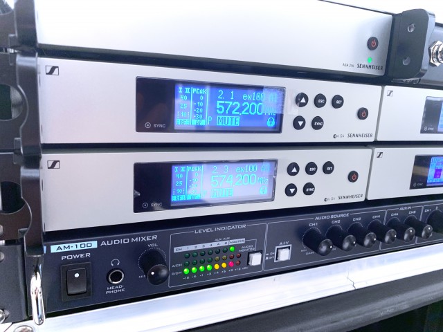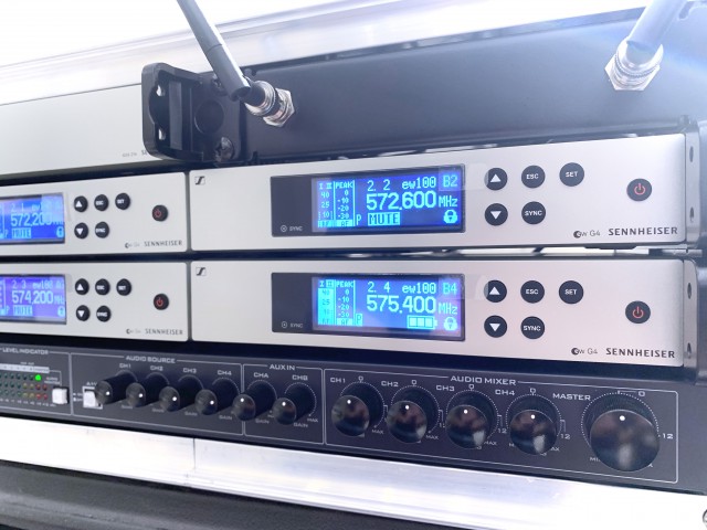 Der endgültige Ton wird vom datavideo AM-100 Line-Mixer geliefert. Der Anschluss über einen Antennensplitter gewährleistet einen störungsfreien Betrieb im True-Diversity-Modus.
