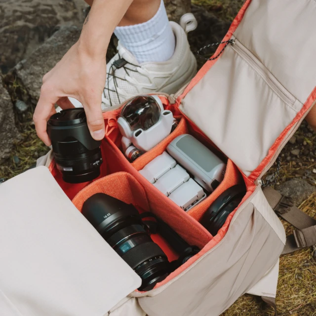 Mit den integrierten, ausziehbaren Fächern können Sie den Rucksack nach Bedarf unterteilen. Klappen Sie alles für den Reisemodus um oder verwenden Sie die Fächer und Trennwände für den Fotokastenmodus. Dieses System verändert die Art und Weise, wie Sie Ihre Ausrüstung transportieren.